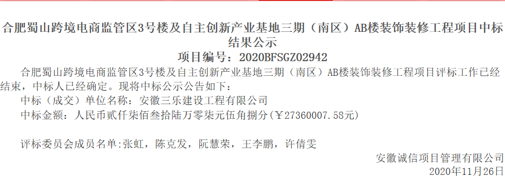 本项目位于青阳路与高刘路交口龚洼安置点(聚凤华庭)南区。主要内容为15811平方米的地下车库及人防工程地面起砂破损、墙根渗水、人防工程内地面墙面渗水、穿墙打洞、设备破损缺失等内容进行维修改造以及地库出入口新建钢构雨棚。 2.合肥蜀山跨境电商监管区3号楼及自主创新产业基地三期(南区)AB楼装饰装修工程项目