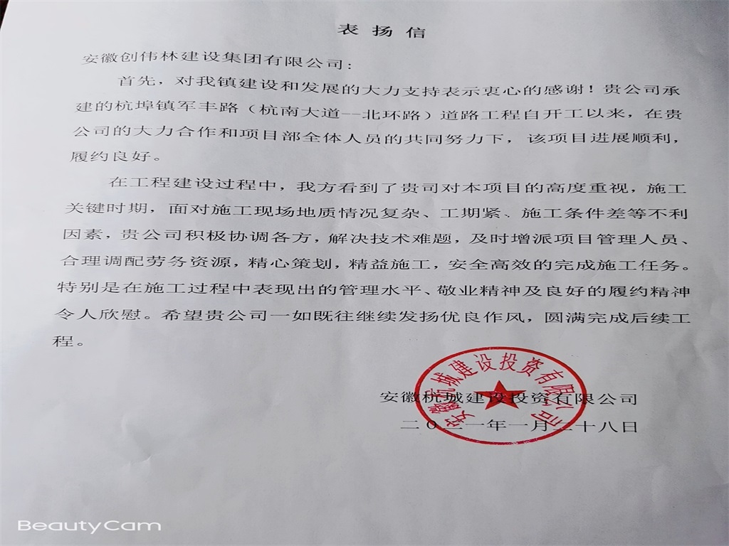 2021年安徽杭城建设投资表扬信
