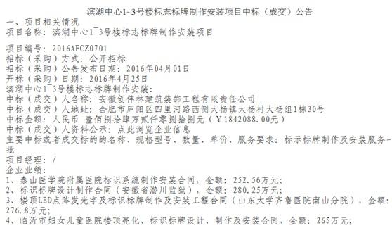 2016年4月15日,经过安徽创伟林建设集团全体人员的不懈努力下,安徽创伟林公司再次中标滨湖中心1~3号楼标志标牌制作安装项目。中标金额1842088元。
